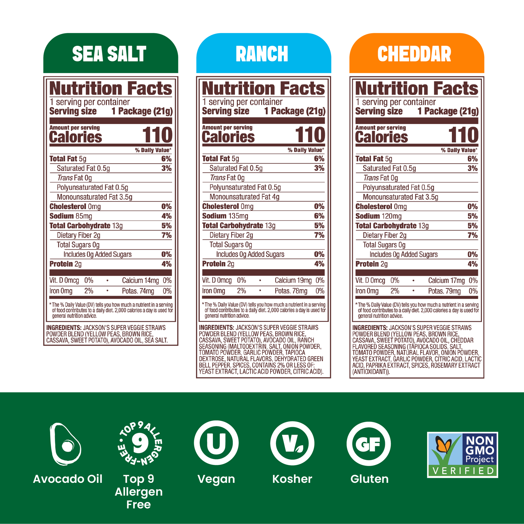 Ranch: Jackson's Super Veggie Straws Powder Blend (Yellow Peas, Brown Rice, Cassava, Sweet Potato), Avocado Oil, Ranch Seasoning (Maltodextrin, Salt, Onion Powder, Tomato Powder, Garlic Powder, Tapioca Dextrose, Natural Flavors, Dehydrated Green Bell Pepper, Spices, Contains 2% Or Less Of: Yeast Extract, Lactic Acid Powder, Citric Acid).