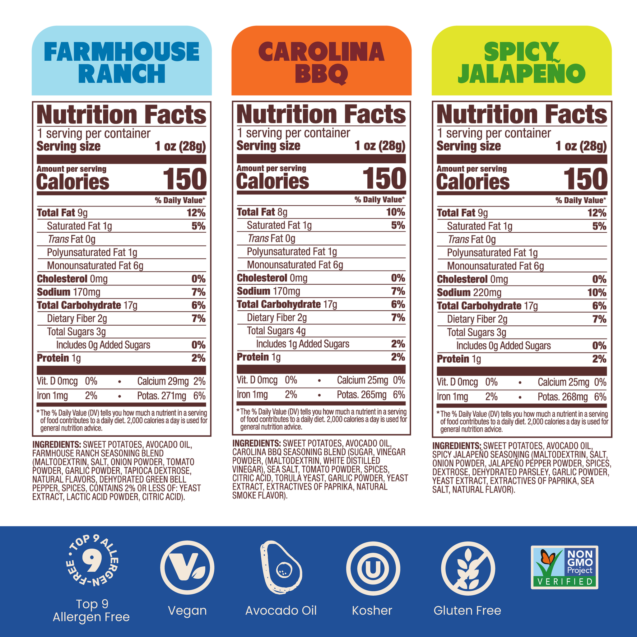 Farmhouse Ranch: Sweet Potatoes, Avocado Oil, Farmhouse Ranch Seasoning Blend (Maltodextrin, Salt, Onion Powder, Tomato Powder, Garlic Powder, Tapioca Dextrose, Natural Flavors, Dehydrated Green Bell Pepper, Spices, Contains 2% or Less of: Yeast Extract, Lactic Acid Powder, Citric Acid).